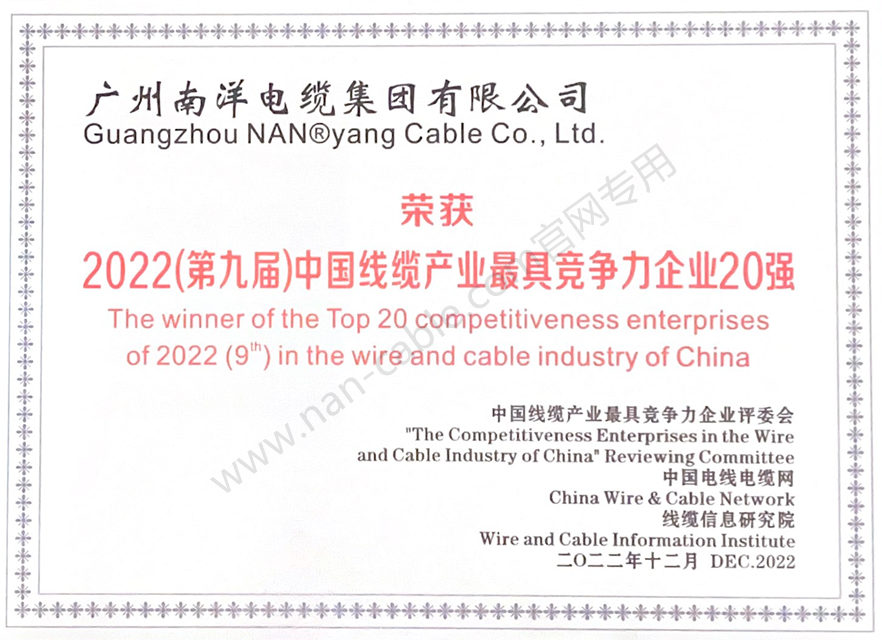 廣東線纜行業(yè)最具競(jìng)爭(zhēng)力企業(yè)第一名、中國(guó)線纜行業(yè)最具競(jìng)爭(zhēng)力企業(yè)20強(qiáng)、華南地區(qū)電線電纜研發(fā)制造龍頭企業(yè)